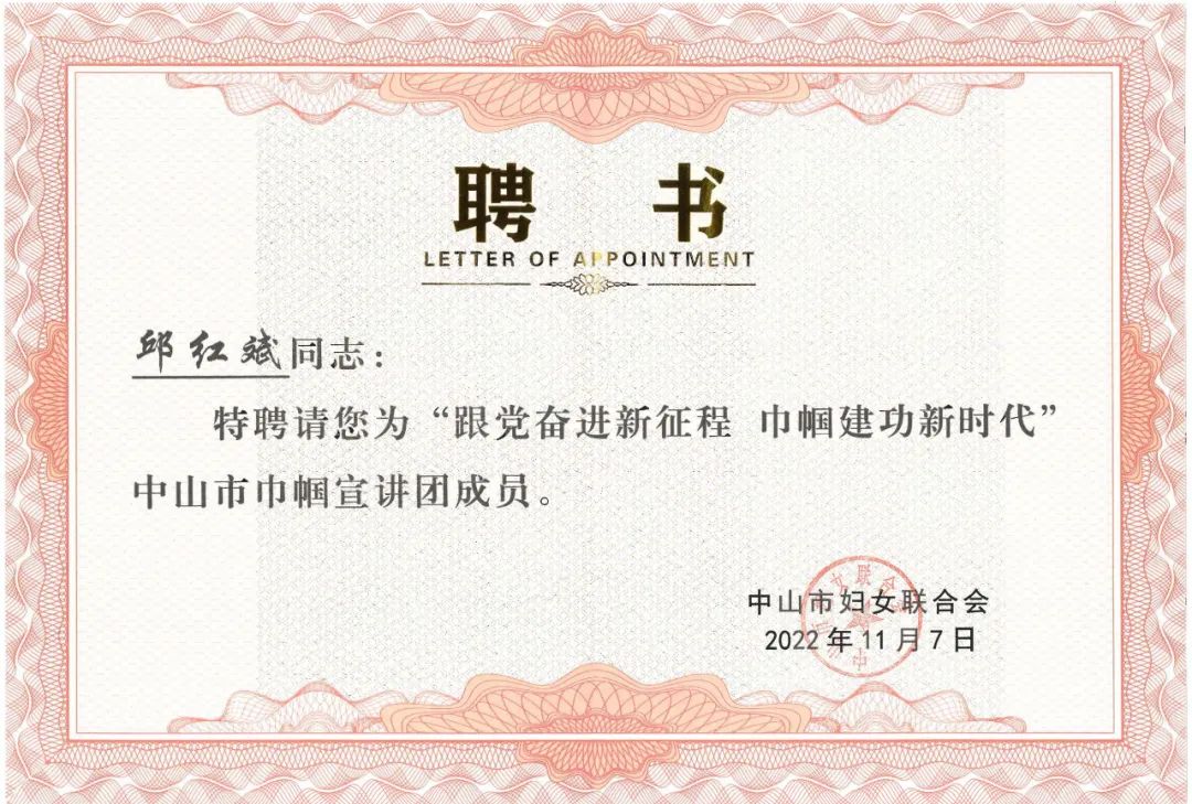 学习贯彻党的二十大精神——我司董事邱红斌女士被聘为中山市巾帼宣讲团成员