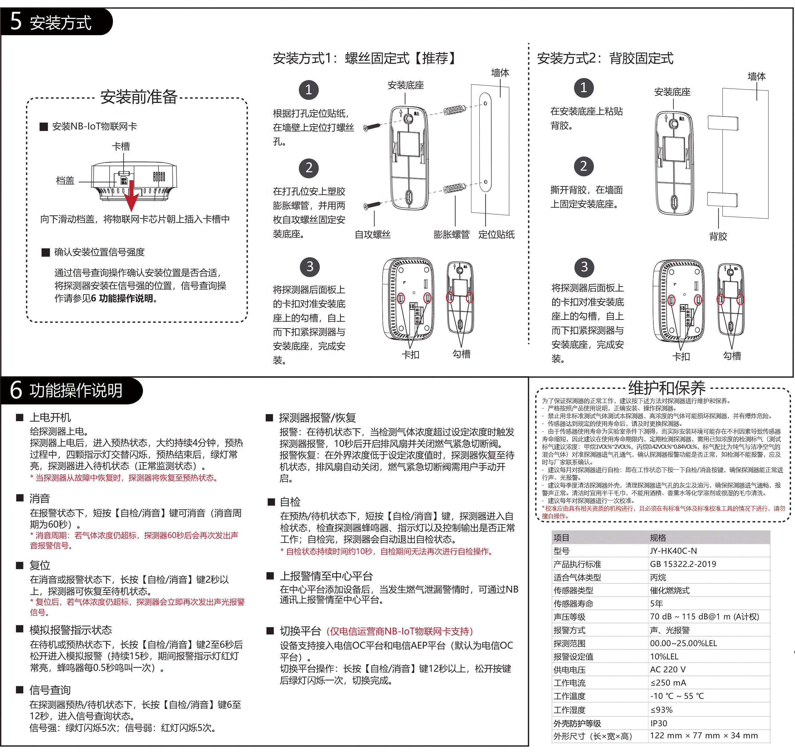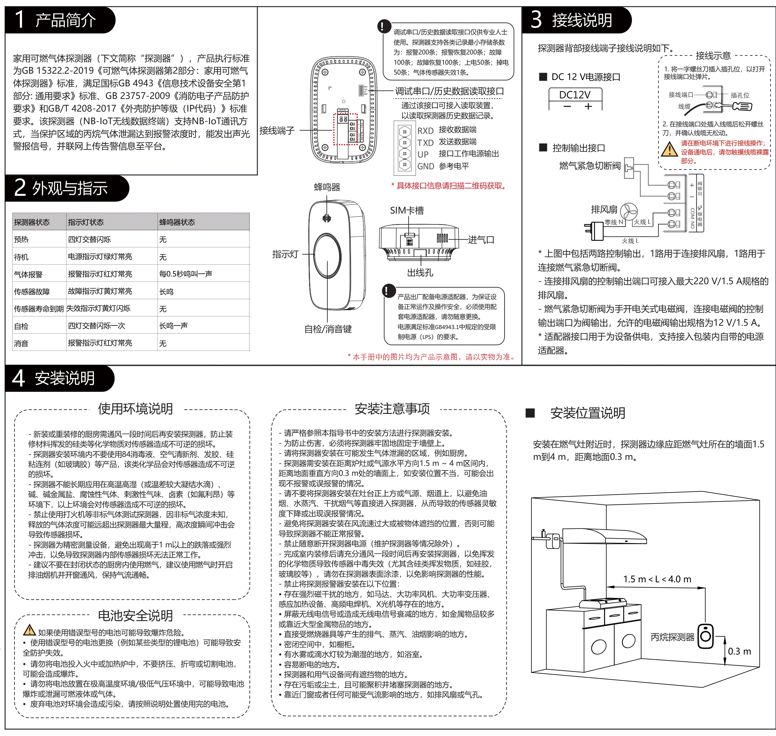 家用可燃气体探测器(下文简称“探测器”),产品执行标准 为GB 15322.2-2019《可燃气体探测器第2部分:家用可燃气 体探测器》标准,满足国标GB 4943《信息技术设备安全第1 部分: 通用要求》标准、GB 23757-2009《消防电子产品防护 要求》和GB/T 4208-2017《外壳防护等级(IP代码)》标准 要求。该探测器(NB-IoT无线数据终端)支持NB-IoT通讯方 式,当保护区域的丙烷气体泄漏达到报警浓度时,能发出声光 警报信号,并联网上传告警信息至平台。